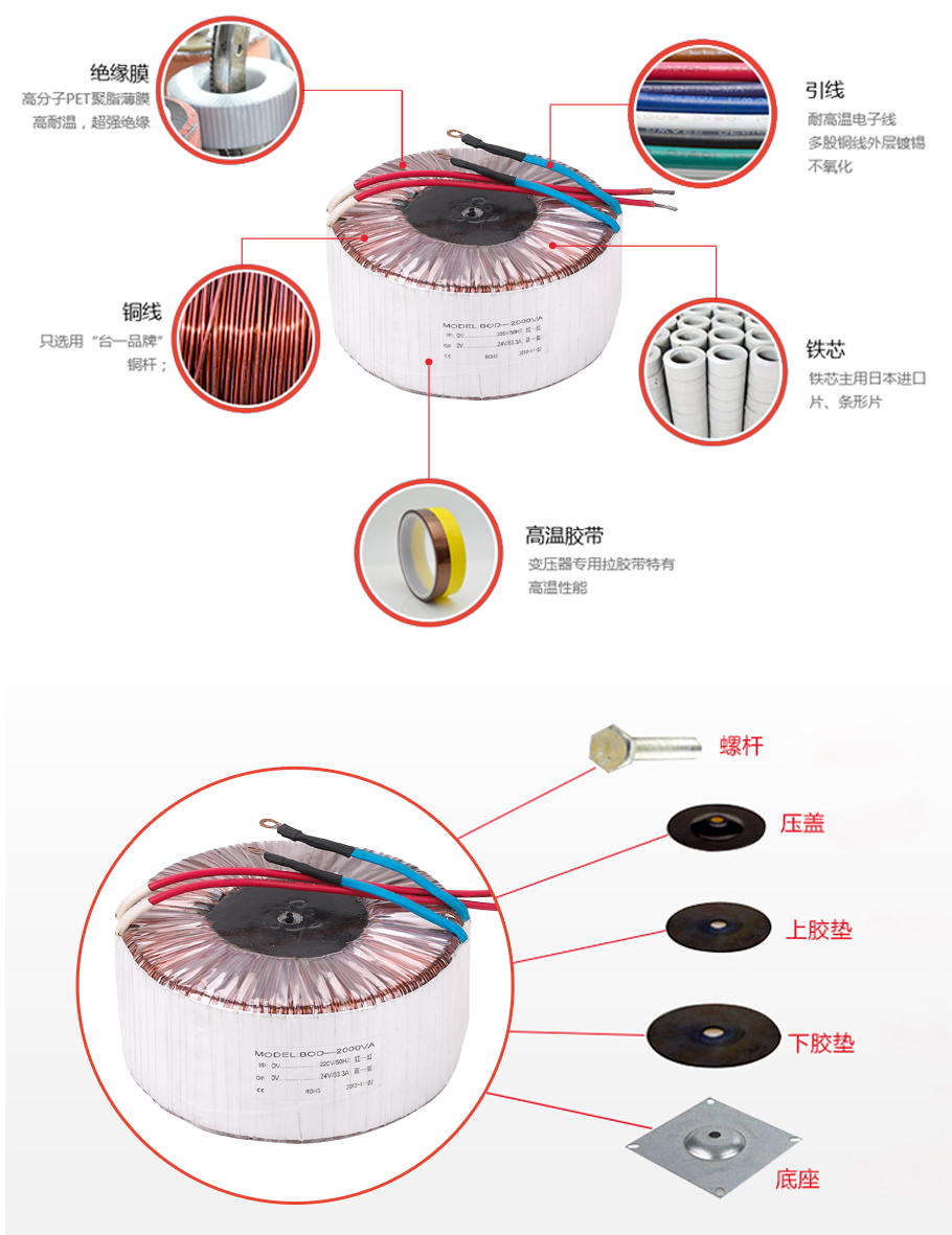 由厚度0.27mm或0.30mm、低铁损高导磁的冷轧取向硅钢片做电磁感应材料,匹配初级绕组和次级绕组来改变交流电压的装置,因产品形状为圆形故称环型变压器。产品具有体积小、效率高、温升低、漏磁小,安装易优点。